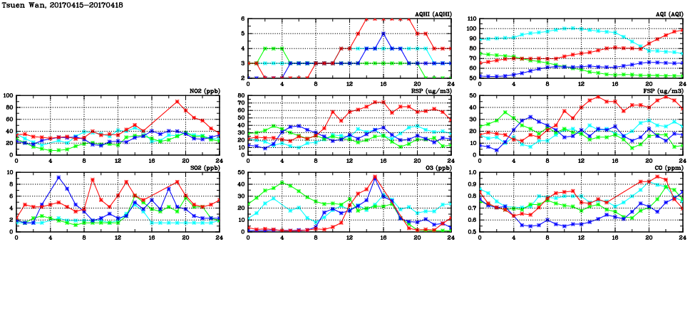 | Air Quality Data Time Series in Tsuen Wan (2017/04/18) | ( Line colors: Day -3 Day -2 Day -1 Current day ) | 2D Map Current AQHI |