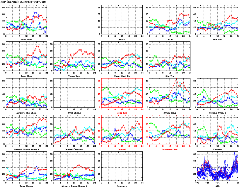 | Air Quality Data Time Series for RSP (2017/04/18) | ( Line colors: Day -3 Day -2 Day -1 Current day ) | 2D Map Current AQHI |