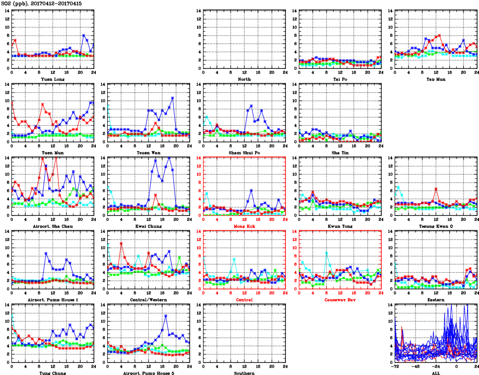 | Air Quality Data Time Series for SO2 (2017/04/15) | ( Line colors: Day -3 Day -2 Day -1 Current day ) | 2D Map Current AQHI |