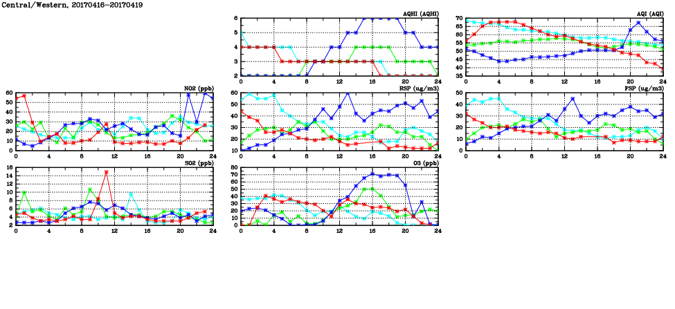 | Air Quality Data Time Series in Central/Western (2017/04/19) | ( Line colors: Day -3 Day -2 Day -1 Current day ) | 2D Map Current AQHI |