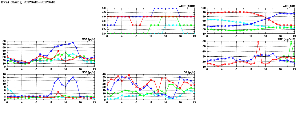 | Air Quality Data Time Series in Kwai Chung (2017/04/15) | ( Line colors: Day -3 Day -2 Day -1 Current day ) | 2D Map Current AQHI |