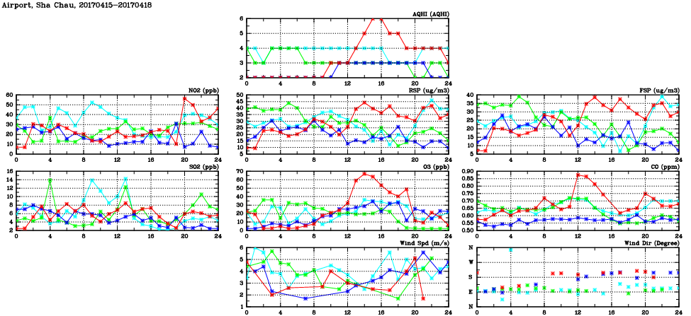 | Air Quality Data Time Series in Airport, Sha Chau (2017/04/18) | ( Line colors: Day -3 Day -2 Day -1 Current day ) | 2D Map Current AQHI |