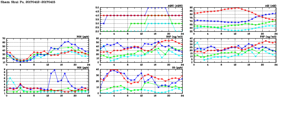 | Air Quality Data Time Series in Sham Shui Po (2017/04/15) | ( Line colors: Day -3 Day -2 Day -1 Current day ) | 2D Map Current AQHI |