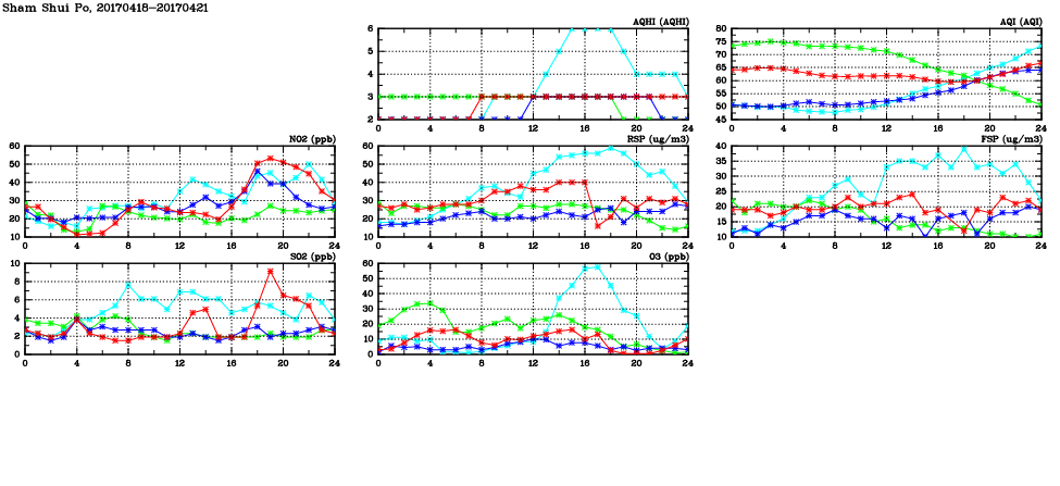 | Air Quality Data Time Series in Sham Shui Po (2017/04/21) | ( Line colors: Day -3 Day -2 Day -1 Current day ) | 2D Map Current AQHI |