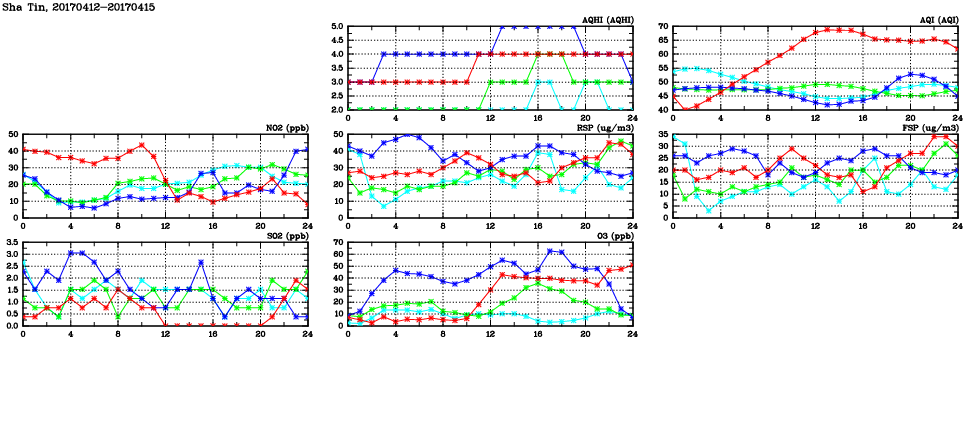 | Air Quality Data Time Series in Sha Tin (2017/04/15) | ( Line colors: Day -3 Day -2 Day -1 Current day ) | 2D Map Current AQHI |