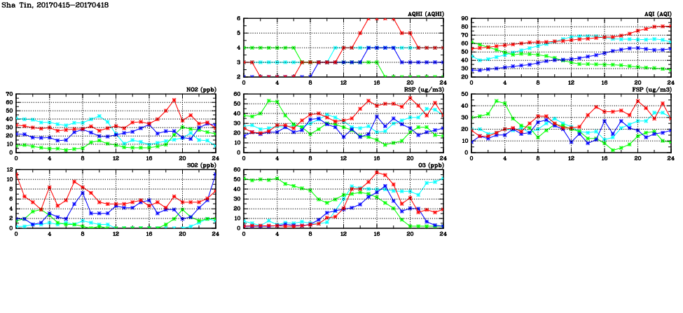 | Air Quality Data Time Series in Sha Tin (2017/04/18) | ( Line colors: Day -3 Day -2 Day -1 Current day ) | 2D Map Current AQHI |