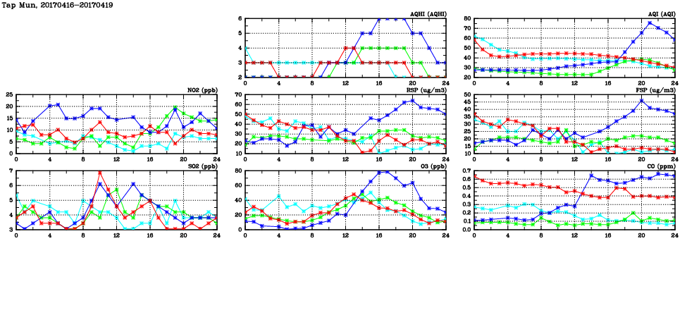 | Air Quality Data Time Series in Tap Mun (2017/04/19) | ( Line colors: Day -3 Day -2 Day -1 Current day ) | 2D Map Current AQHI |