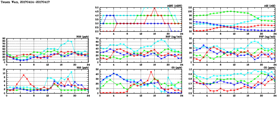 | Air Quality Data Time Series in Tsuen Wan (2017/04/17) | ( Line colors: Day -3 Day -2 Day -1 Current day ) | 2D Map Current AQHI |