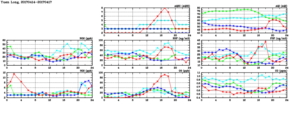 | Air Quality Data Time Series in Yuen Long (2017/04/17) | ( Line colors: Day -3 Day -2 Day -1 Current day ) | 2D Map Current AQHI |