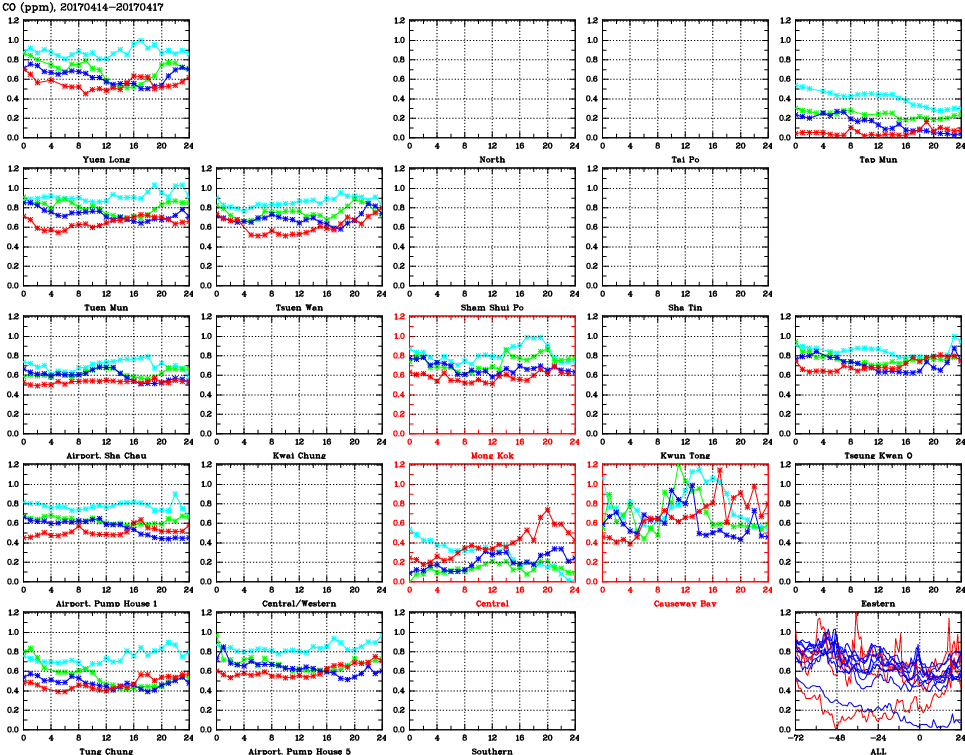 | Air Quality Data Time Series for CO (2017/04/17) | ( Line colors: Day -3 Day -2 Day -1 Current day ) | 2D Map Current AQHI |