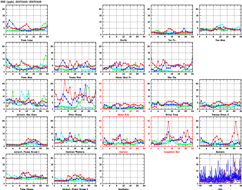 | Air Quality Data Time Series for SO2 (2017/04/18) | ( Line colors: Day -3 Day -2 Day -1 Current day ) | 2D Map Current AQHI |