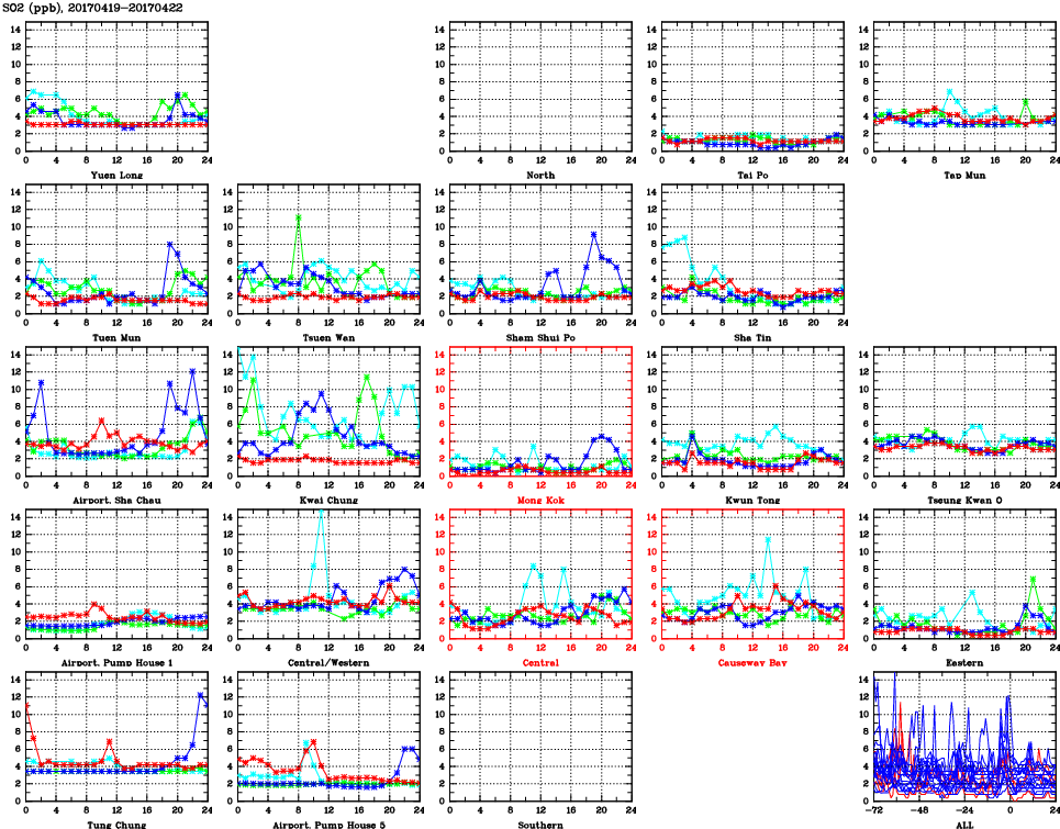 | Air Quality Data Time Series for SO2 (2017/04/22) | ( Line colors: Day -3 Day -2 Day -1 Current day ) | 2D Map Current AQHI |