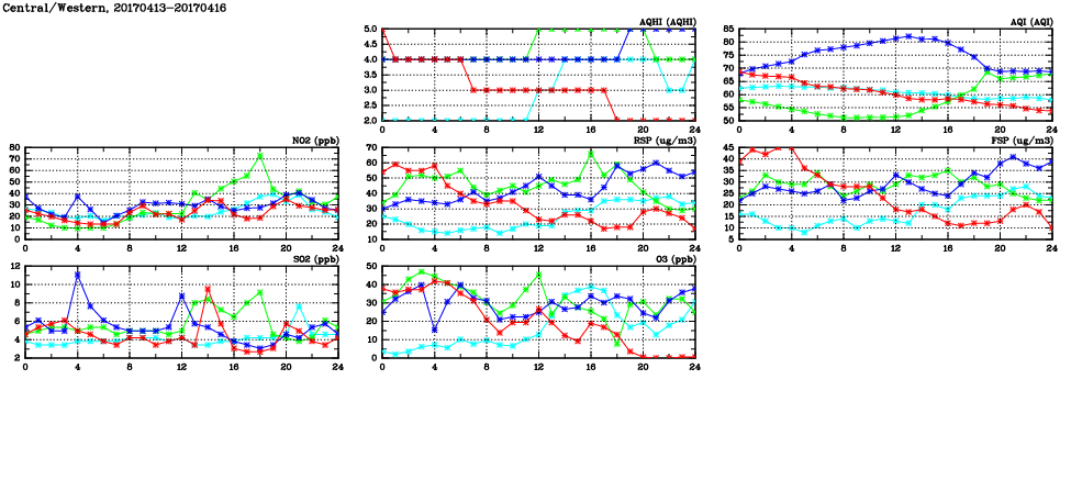 | Air Quality Data Time Series in Central/Western (2017/04/16) | ( Line colors: Day -3 Day -2 Day -1 Current day ) | 2D Map Current AQHI |