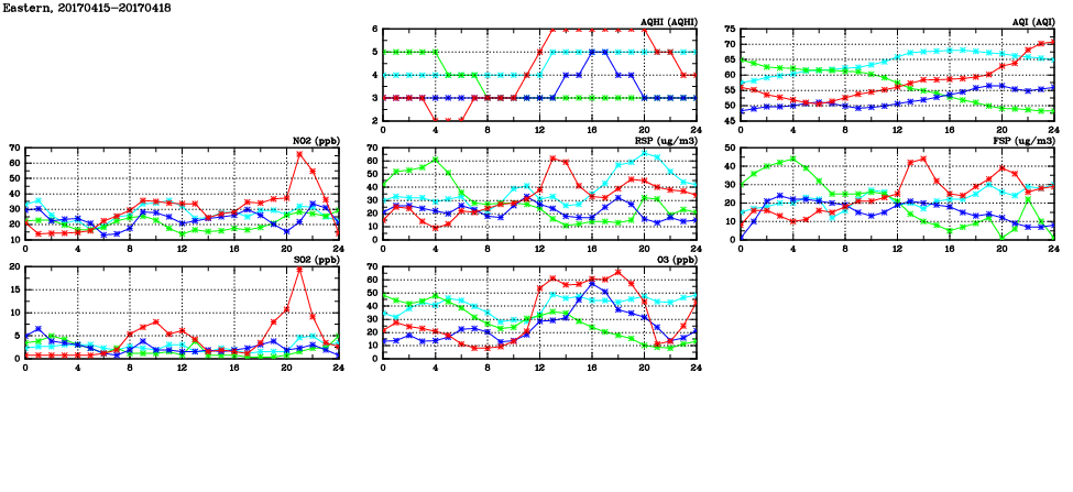 | Air Quality Data Time Series in Eastern (2017/04/18) | ( Line colors: Day -3 Day -2 Day -1 Current day ) | 2D Map Current AQHI |