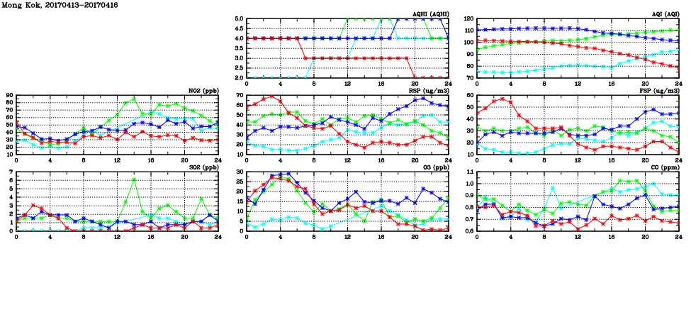 | Air Quality Data Time Series in Mong Kok (2017/04/16) | ( Line colors: Day -3 Day -2 Day -1 Current day ) | 2D Map Current AQHI |