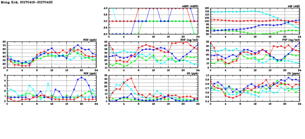 | Air Quality Data Time Series in Mong Kok (2017/04/22) | ( Line colors: Day -3 Day -2 Day -1 Current day ) | 2D Map Current AQHI |