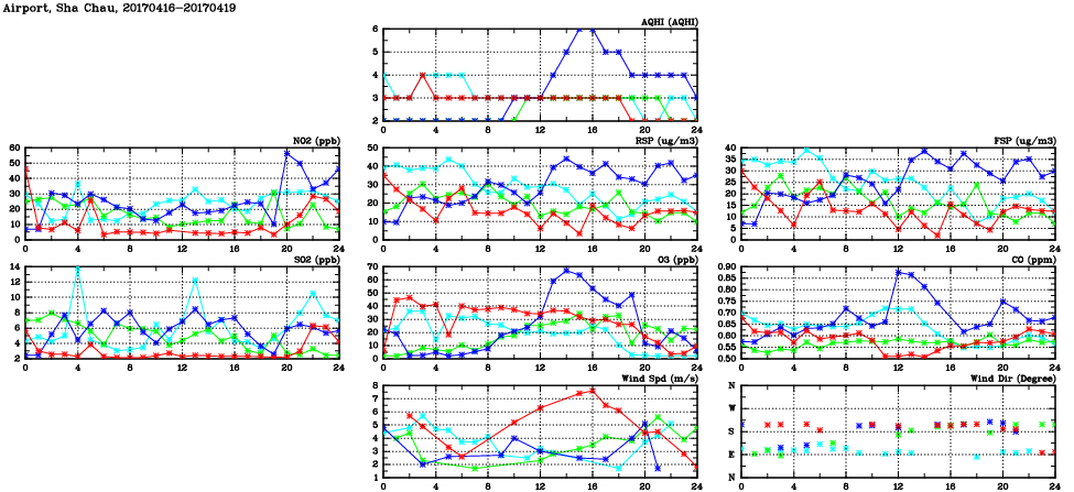 | Air Quality Data Time Series in Airport, Sha Chau (2017/04/19) | ( Line colors: Day -3 Day -2 Day -1 Current day ) | 2D Map Current AQHI |