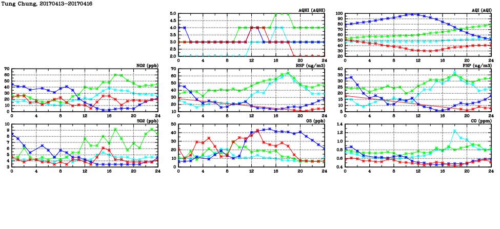 | Air Quality Data Time Series in Tung Chung (2017/04/16) | ( Line colors: Day -3 Day -2 Day -1 Current day ) | 2D Map Current AQHI |