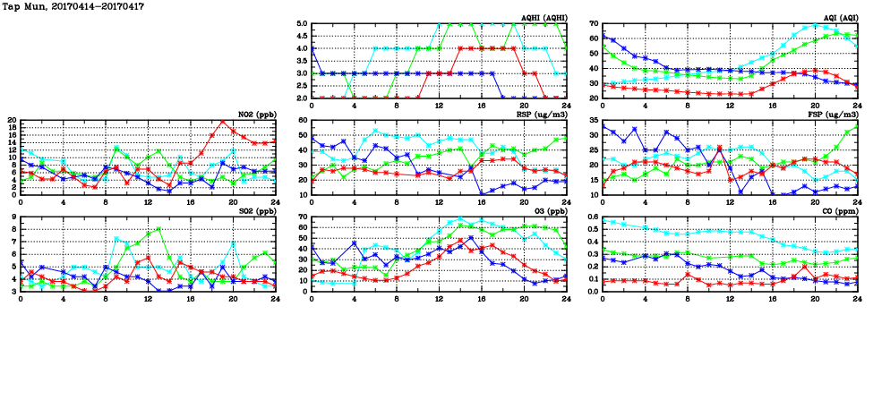 | Air Quality Data Time Series in Tap Mun (2017/04/17) | ( Line colors: Day -3 Day -2 Day -1 Current day ) | 2D Map Current AQHI |