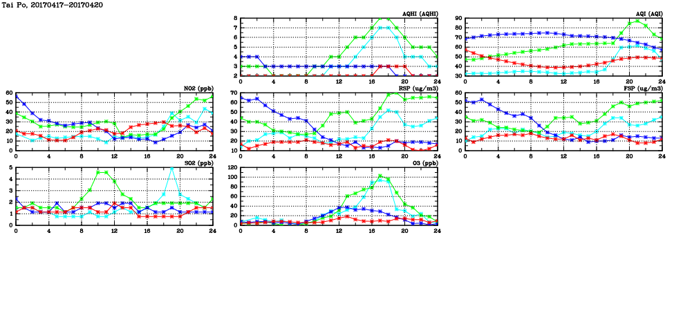 | Air Quality Data Time Series in Tai Po (2017/04/20) | ( Line colors: Day -3 Day -2 Day -1 Current day ) | 2D Map Current AQHI |
