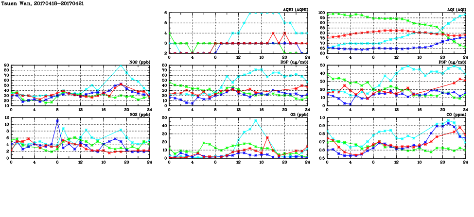 | Air Quality Data Time Series in Tsuen Wan (2017/04/21) | ( Line colors: Day -3 Day -2 Day -1 Current day ) | 2D Map Current AQHI |