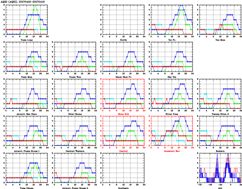 | Air Quality Data Time Series for AQHI (2017/04/19) | ( Line colors: Day -3 Day -2 Day -1 Current day ) | 2D Map Current AQHI |