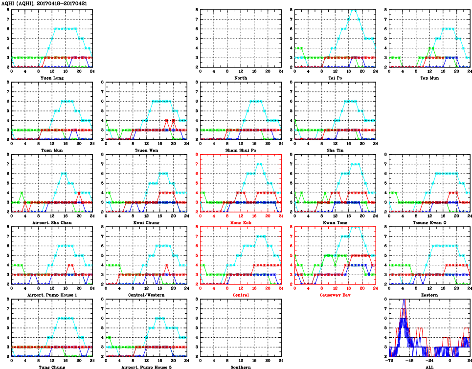 | Air Quality Data Time Series for AQHI (2017/04/21) | ( Line colors: Day -3 Day -2 Day -1 Current day ) | 2D Map Current AQHI |
