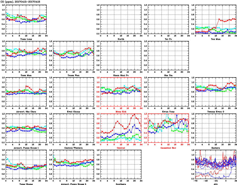 | Air Quality Data Time Series for CO (2017/04/18) | ( Line colors: Day -3 Day -2 Day -1 Current day ) | 2D Map Current AQHI |