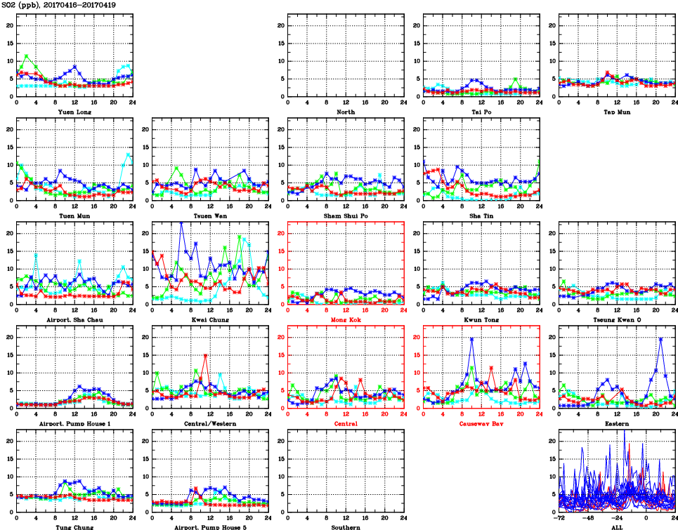 | Air Quality Data Time Series for SO2 (2017/04/19) | ( Line colors: Day -3 Day -2 Day -1 Current day ) | 2D Map Current AQHI |