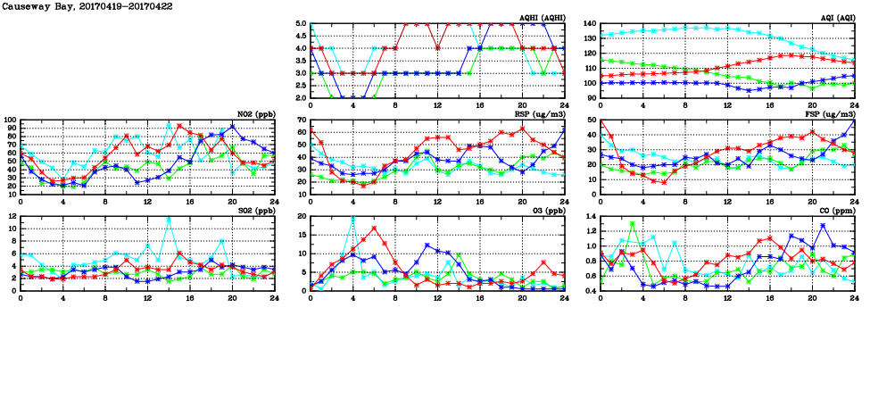 | Air Quality Data Time Series in Causeway Bay (2017/04/22) | ( Line colors: Day -3 Day -2 Day -1 Current day ) | 2D Map Current AQHI |