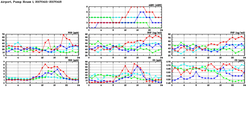 | Air Quality Data Time Series in Airport, Pump House 1 (2017/04/18) | ( Line colors: Day -3 Day -2 Day -1 Current day ) | 2D Map Current AQHI |