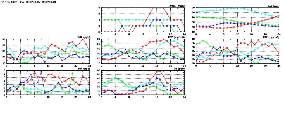 | Air Quality Data Time Series in Sham Shui Po (2017/04/18) | ( Line colors: Day -3 Day -2 Day -1 Current day ) | 2D Map Current AQHI |