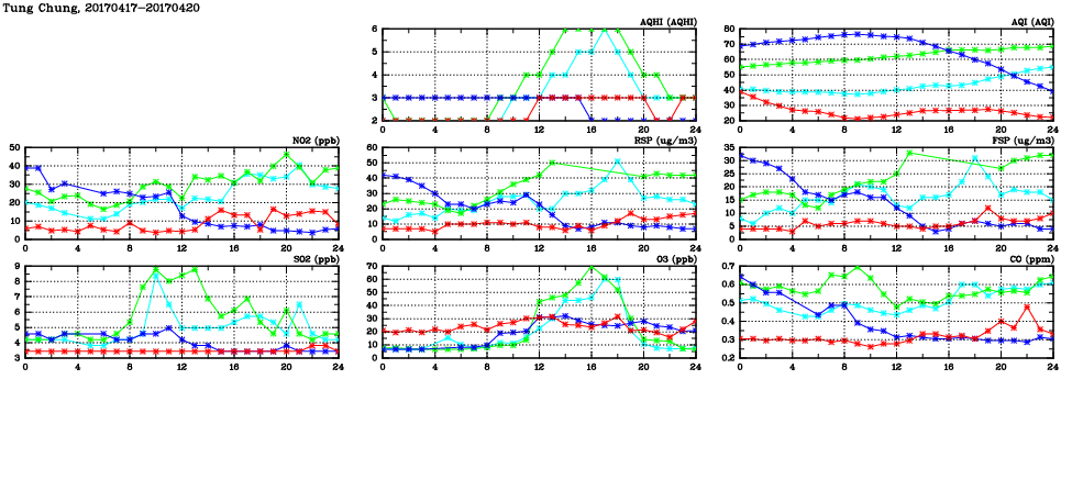 | Air Quality Data Time Series in Tung Chung (2017/04/20) | ( Line colors: Day -3 Day -2 Day -1 Current day ) | 2D Map Current AQHI |