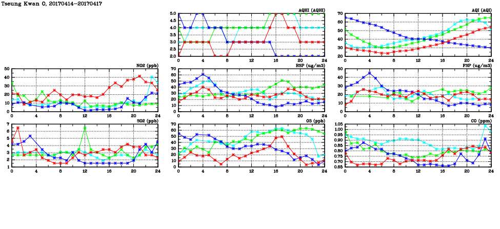 | Air Quality Data Time Series in Tseung Kwan O (2017/04/17) | ( Line colors: Day -3 Day -2 Day -1 Current day ) | 2D Map Current AQHI |