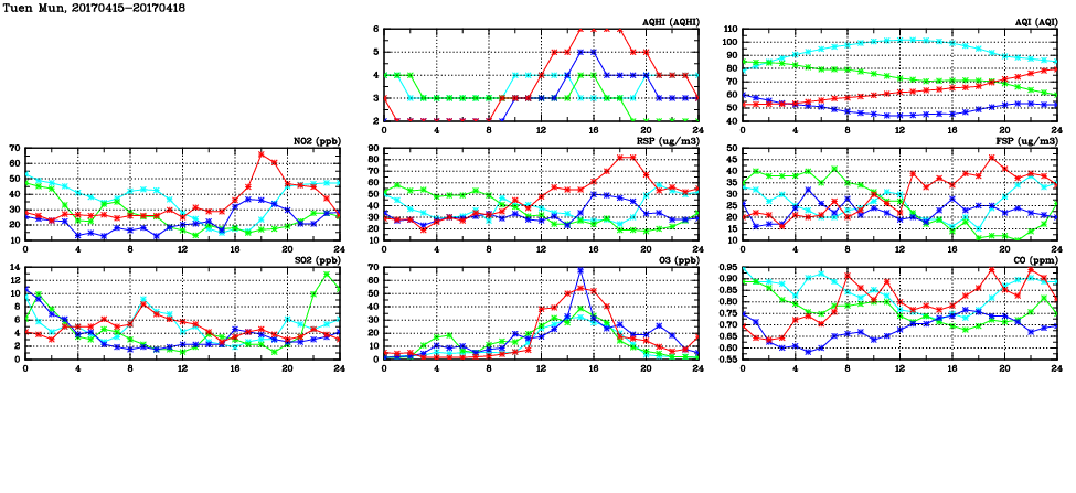 | Air Quality Data Time Series in Tuen Mun (2017/04/18) | ( Line colors: Day -3 Day -2 Day -1 Current day ) | 2D Map Current AQHI |