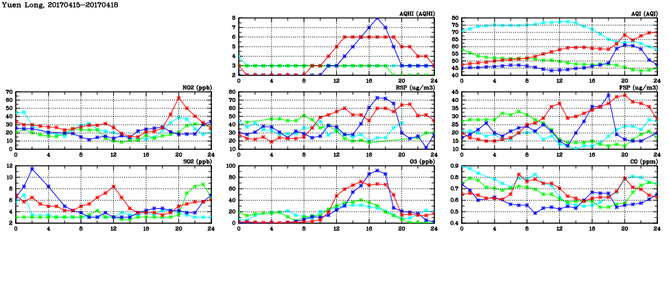 | Air Quality Data Time Series in Yuen Long (2017/04/18) | ( Line colors: Day -3 Day -2 Day -1 Current day ) | 2D Map Current AQHI |