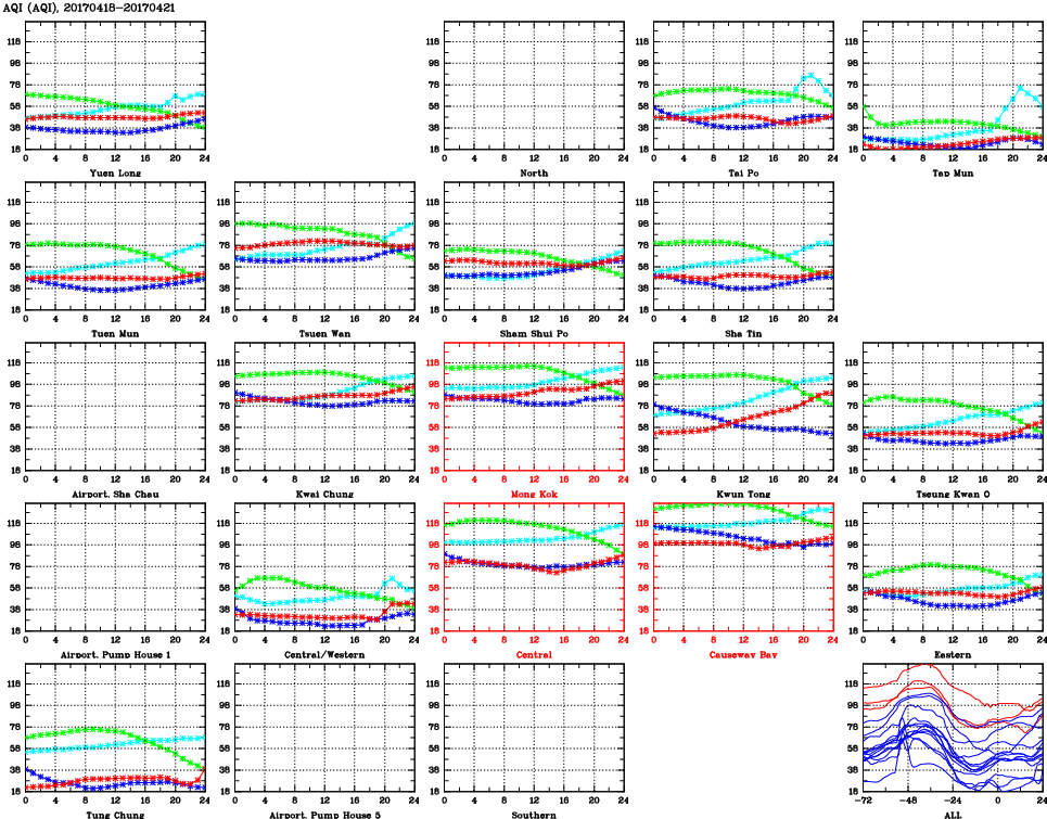 | Air Quality Data Time Series for AQI (2017/04/21) | ( Line colors: Day -3 Day -2 Day -1 Current day ) | 2D Map Current AQHI |