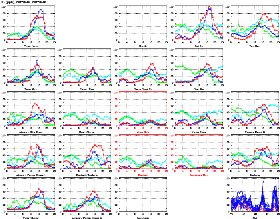 | Air Quality Data Time Series for O3 (2017/04/18) | ( Line colors: Day -3 Day -2 Day -1 Current day ) | 2D Map Current AQHI |
