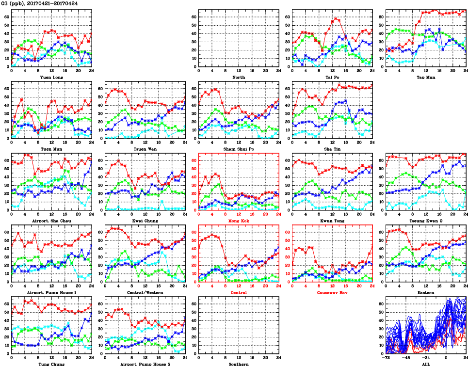 | Air Quality Data Time Series for O3 (2017/04/24) | ( Line colors: Day -3 Day -2 Day -1 Current day ) | 2D Map Current AQHI |