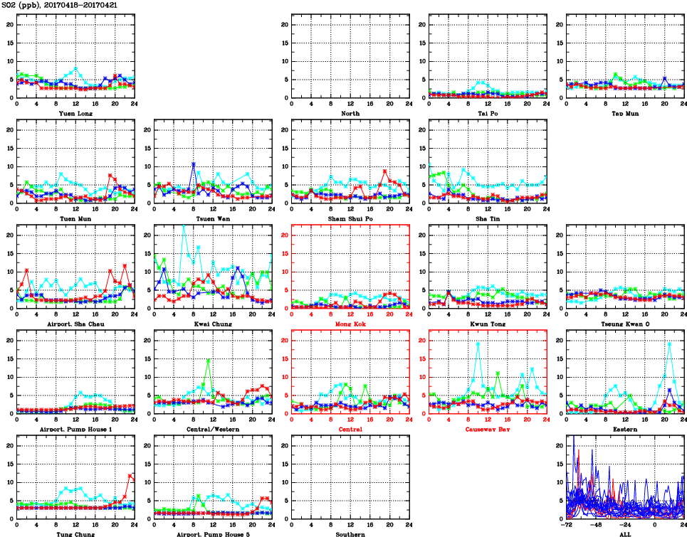 | Air Quality Data Time Series for SO2 (2017/04/21) | ( Line colors: Day -3 Day -2 Day -1 Current day ) | 2D Map Current AQHI |