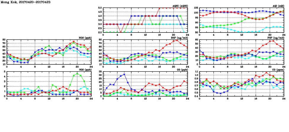 | Air Quality Data Time Series in Mong Kok (2017/04/23) | ( Line colors: Day -3 Day -2 Day -1 Current day ) | 2D Map Current AQHI |