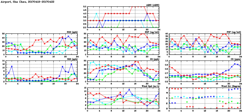 | Air Quality Data Time Series in Airport, Sha Chau (2017/04/22) | ( Line colors: Day -3 Day -2 Day -1 Current day ) | 2D Map Current AQHI |