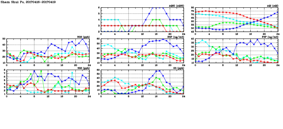 | Air Quality Data Time Series in Sham Shui Po (2017/04/19) | ( Line colors: Day -3 Day -2 Day -1 Current day ) | 2D Map Current AQHI |