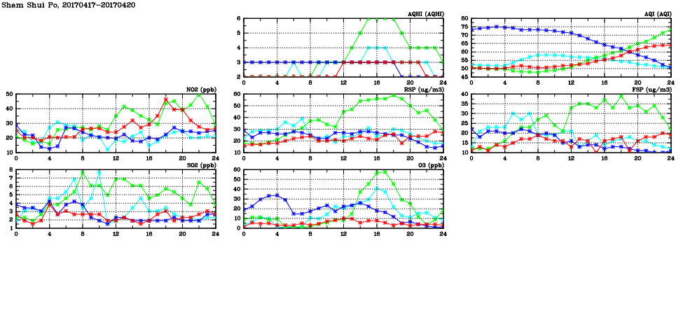 | Air Quality Data Time Series in Sham Shui Po (2017/04/20) | ( Line colors: Day -3 Day -2 Day -1 Current day ) | 2D Map Current AQHI |