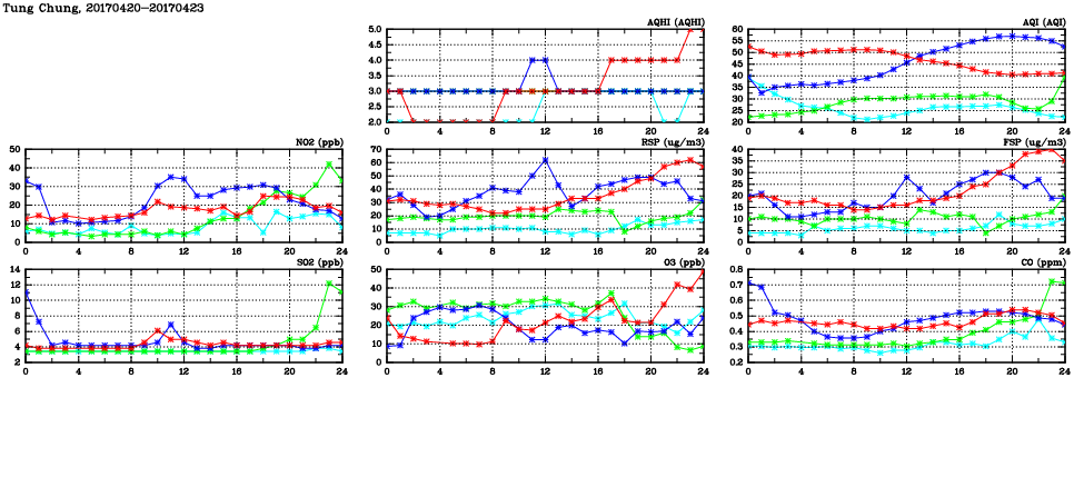 | Air Quality Data Time Series in Tung Chung (2017/04/23) | ( Line colors: Day -3 Day -2 Day -1 Current day ) | 2D Map Current AQHI |