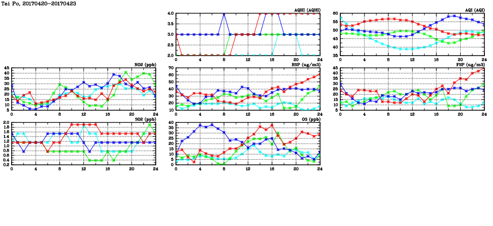| Air Quality Data Time Series in Tai Po (2017/04/23) | ( Line colors: Day -3 Day -2 Day -1 Current day ) | 2D Map Current AQHI |