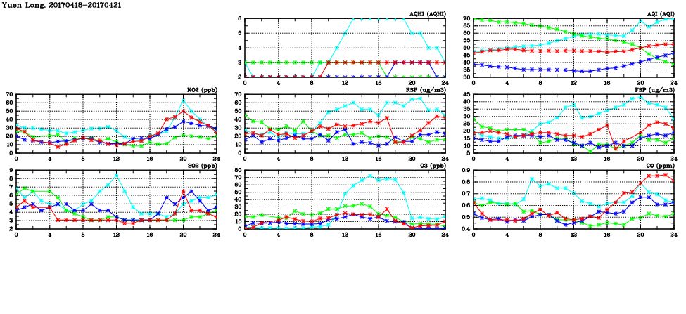 | Air Quality Data Time Series in Yuen Long (2017/04/21) | ( Line colors: Day -3 Day -2 Day -1 Current day ) | 2D Map Current AQHI |