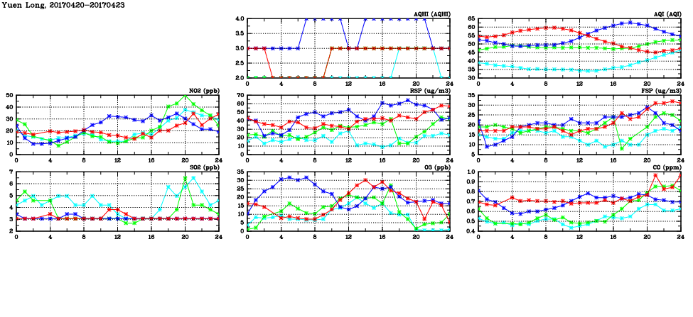 | Air Quality Data Time Series in Yuen Long (2017/04/23) | ( Line colors: Day -3 Day -2 Day -1 Current day ) | 2D Map Current AQHI |