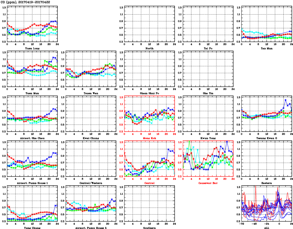 Air Quality Data Time Series for CO (2017/04/22) ( Line colors: Day -3 Day -2 Day -1 Current day ) 2D Map   Current AQHI