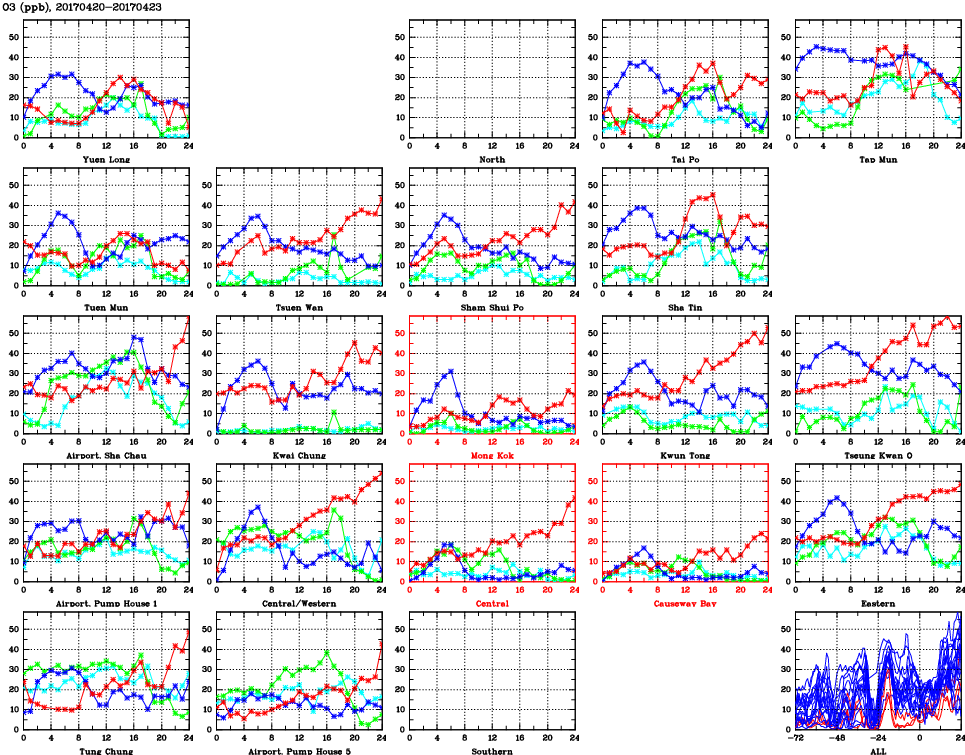| Air Quality Data Time Series for O3 (2017/04/23) | ( Line colors: Day -3 Day -2 Day -1 Current day ) | 2D Map Current AQHI |
